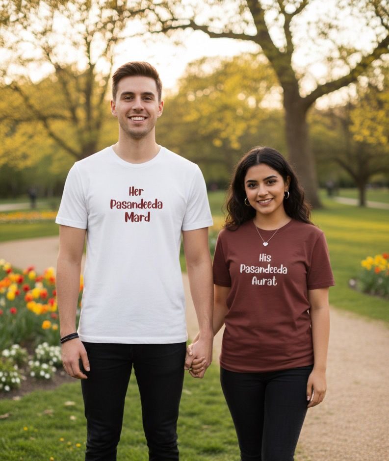 - Design: Elegant couple statement set — Men’s white T-shirt says “Her Pasandeeda Mard” Women’s brown T-shirt reads “His Pasandeeda Aurat”..