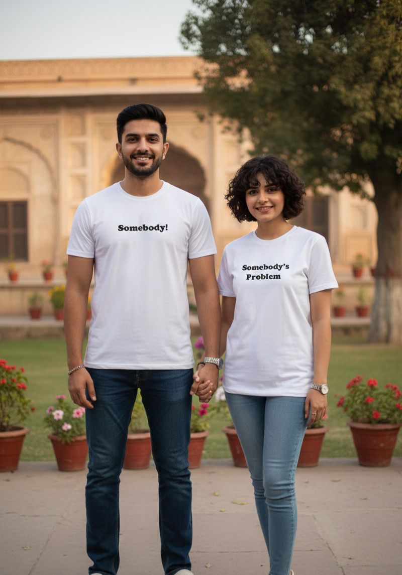 - Design: Bold and witty couple statement set — Men’s T-shirt says “somebody” Women’s T-shirt completes it with “somebody’s problem”, serving humor, confidence, and unapologetic couple energy.